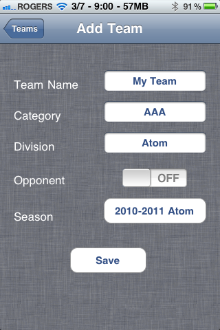 To add a team, hit the Edit button and then the '+' button and you will be taken to the Add Team screen. Fill in the details of the team. If this is the team you are tracking, leave the Opponent switch set to 'Off'. If this is one of your opponents, obviously turn the Opponent switch to 'On'.